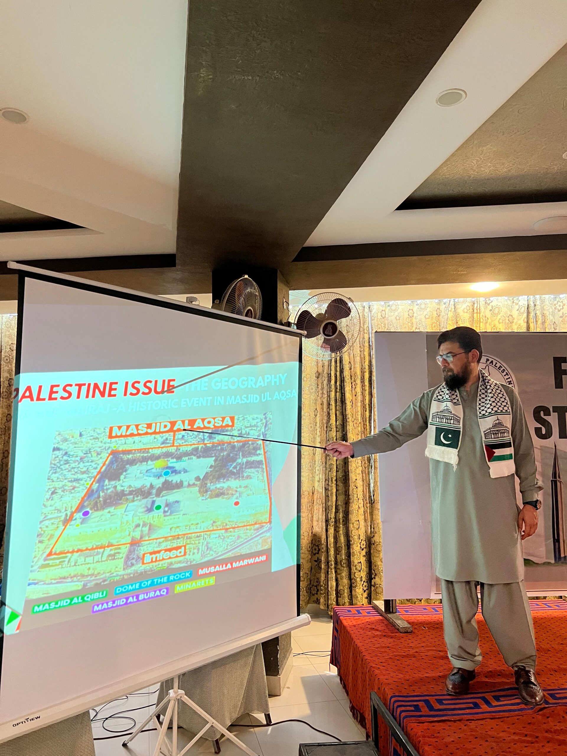 after the documentary, a presentation on palestine’s geography, borders, and history was shown. this presentation helped the audience understand the gaza and israel conflict in a broader context. maps and historical background were shared to explain how the palestinian issue has developed over the decades, giving participants a clear picture of the struggles and injustice faced by the people of palestine۔