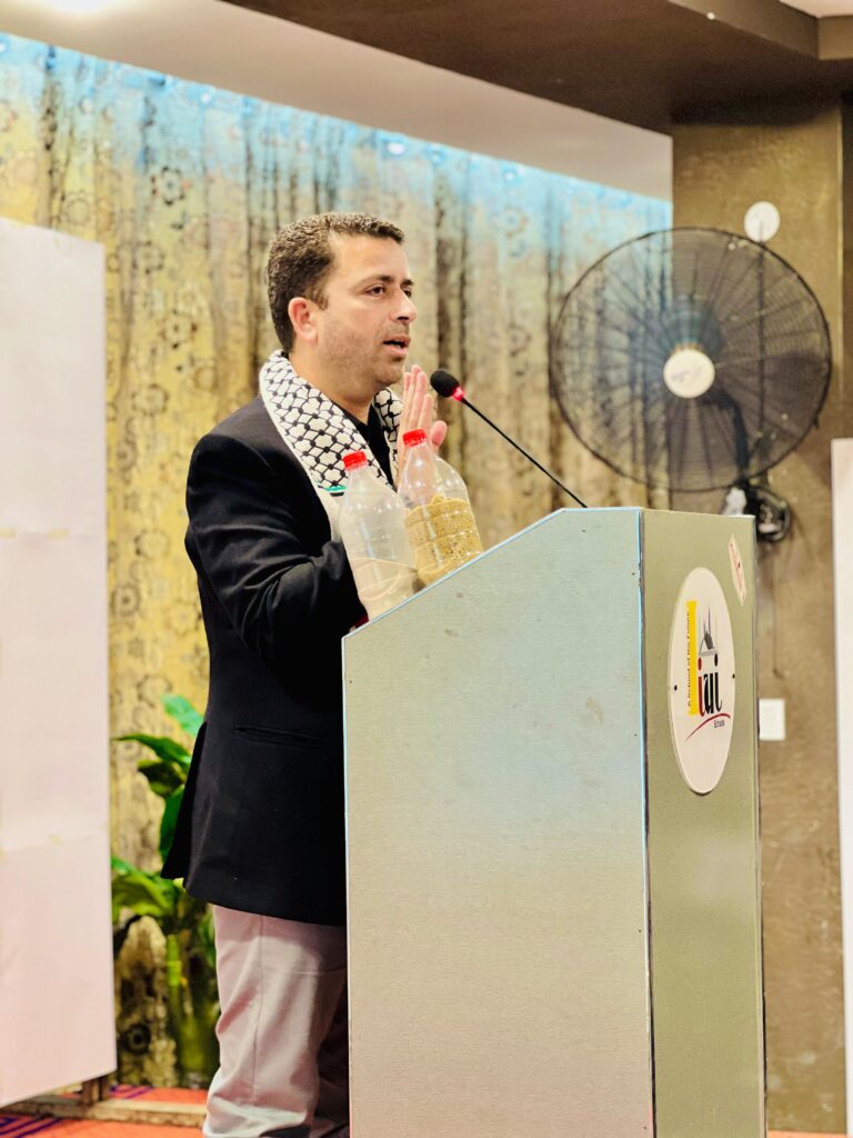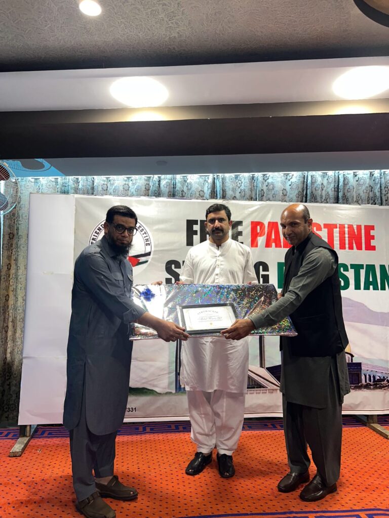 The second chief guest was Dr. Bilal Istighlal, Director General of Friends of Palestine Pakistan. He is also a well-known journalist and has been serving the cause of Palestine with great dedication. In his address, he thanked the people of Pakistan for their continuous support and stressed the importance of standing together for Palestine. During the event, sacred soil from Palestine was also displayed, symbolizing the deep connection and love between Pakistanis and Palestinians.