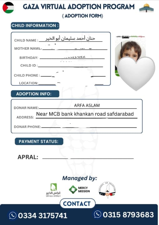 The Virtual Child Adoption Program is a new project by Merciment and Friends of Palestine. Our team in Gaza collects and checks the documents of children who have lost their parents in the war. These documents are verified and shared with kind-hearted donors in Pakistan. Donors can choose a child from the files and support them every month. This is your chance to care for a poor orphan in Gaza — all while living in Pakistan, through a safe and trusted online system.